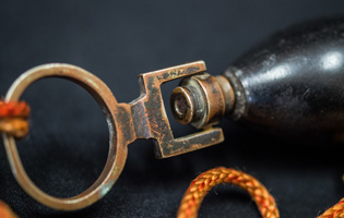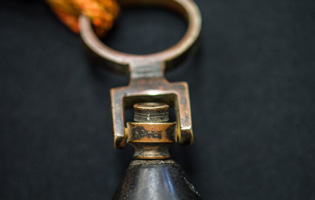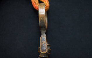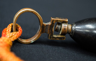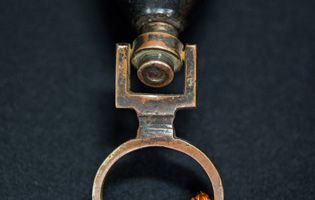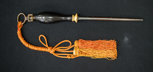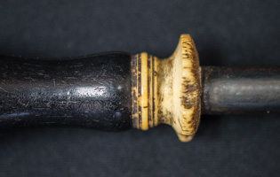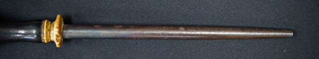 鍔は鹿角で出来ている(少し破損している。)柄は黒檀で出来ている。柄が卵型のは初見である。柄の金具も変っており名和弓雄先生の高弟の方もこんな柄は初めて見たという程珍品である。