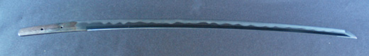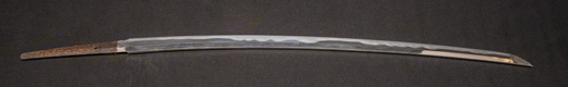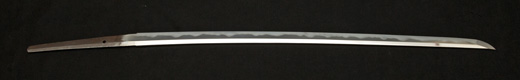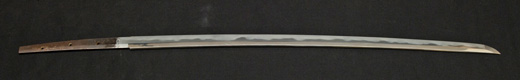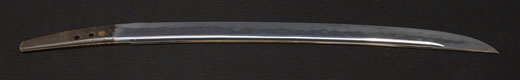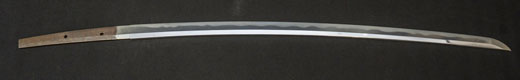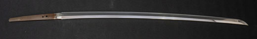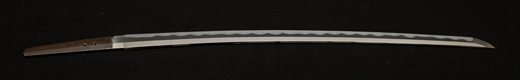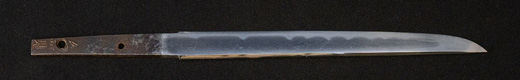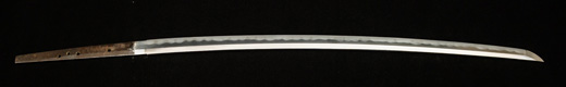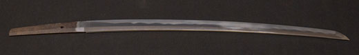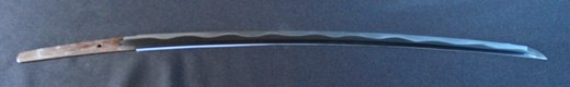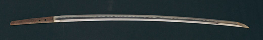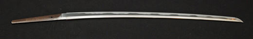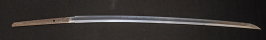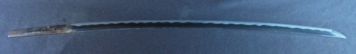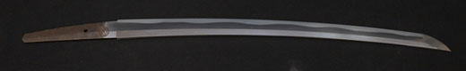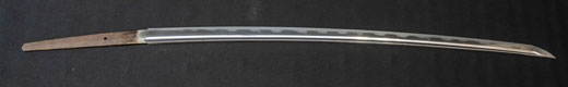 | 刀長 54.2cm(1尺7寸9分) 反り 0.8cm(2分6厘) 元幅 2.78cm 先幅 2.57cm 元重 6.3mm 先重 5.4mm 重量裸身500g 茎 生 目釘穴1 刃文互ノ目乱 |