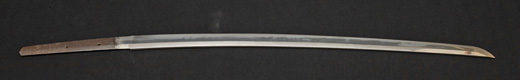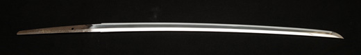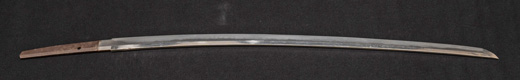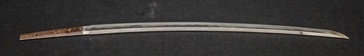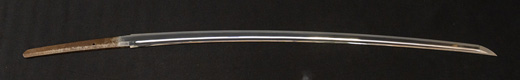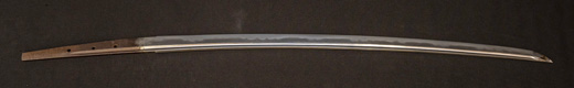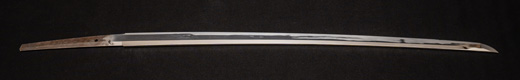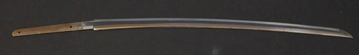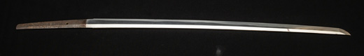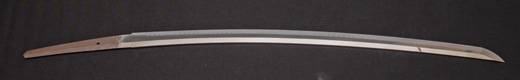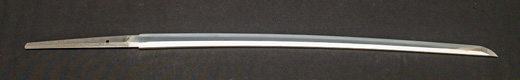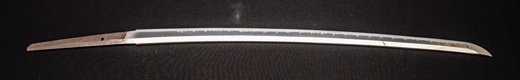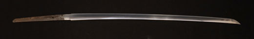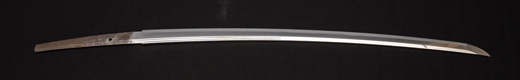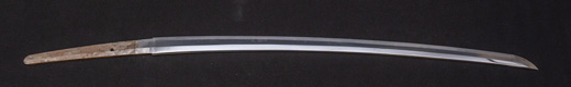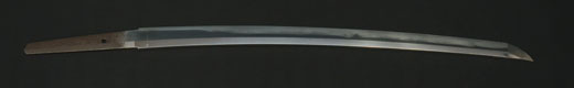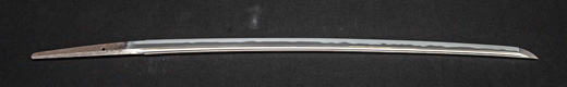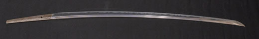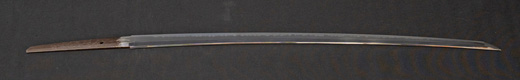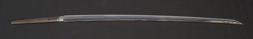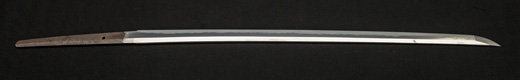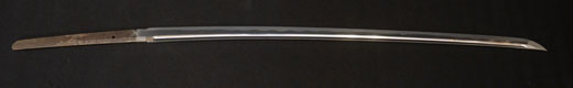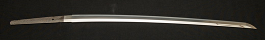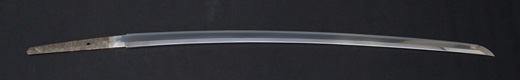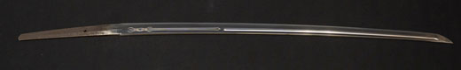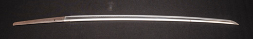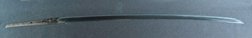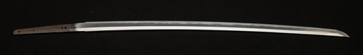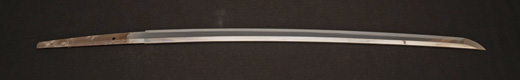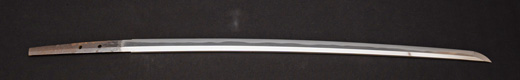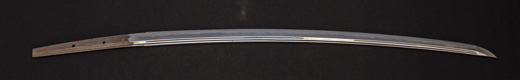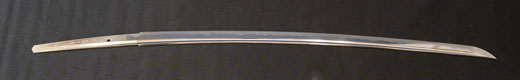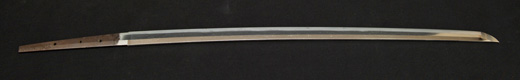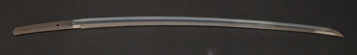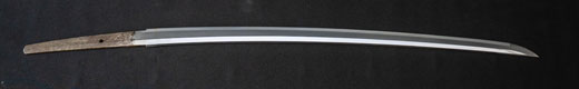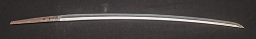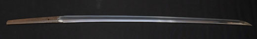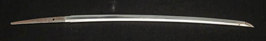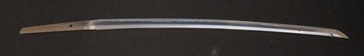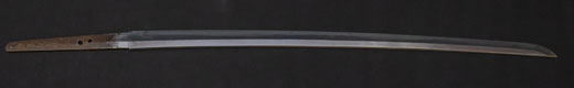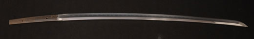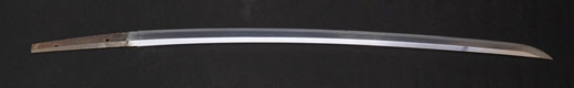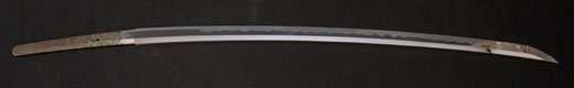 | 刀長 47.8cm(1尺5寸8分) 反り 1.3cm(4分3厘) 元幅 2.48cm 先幅 1.82cm 元重 5.8mm 先重 4.2mm重量裸身320g 茎 摺上 目釘穴 3刃文直刃 |