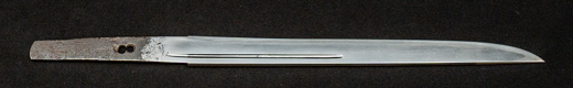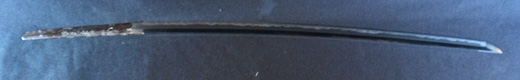 | 刀長 24.4cm(9寸1分) 反り なし 元幅 2.24cm 先幅 1.79cm 元重 6.2mm 先重 4.9mm 重量裸身100g 鞘を払って300g 茎 生 目釘穴 3刃文のたれ |