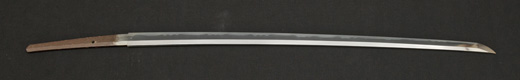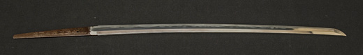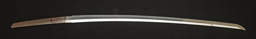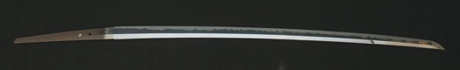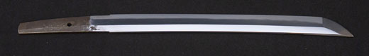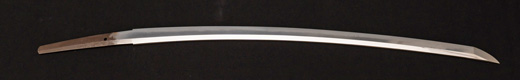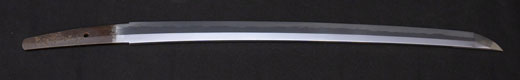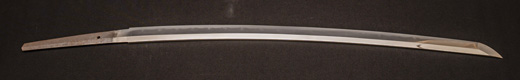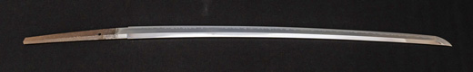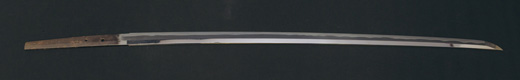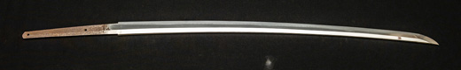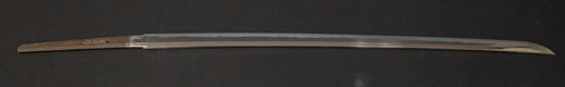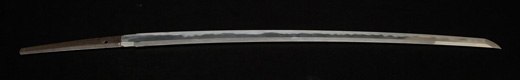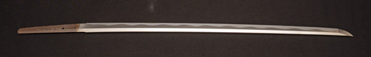 | 刀長 47.9cm(1尺5寸8分) 反り 0.6(2分) 元幅 3.31cm 先幅 2.32cm 元重 8.0mm 先重 6.1mm刀身重量 裸身720g 茎 生 目釘穴 2 刃文のたれ刃 |