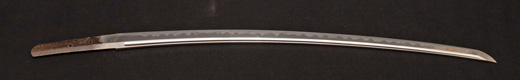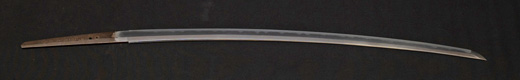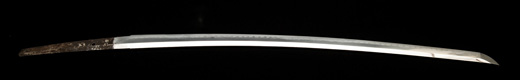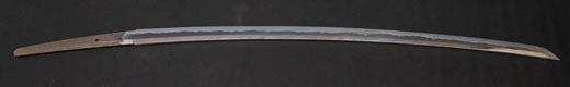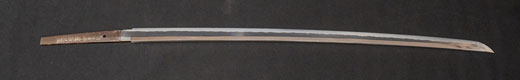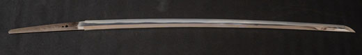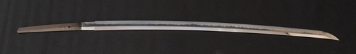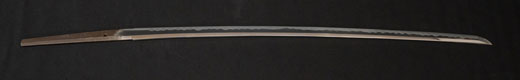 | 刀長 72.6cm(2尺4寸弱) 反り 1.0cm(3分3厘) 元幅 3.22cm 先幅 2.52cm 元重 7.8mm 先重 5.9 mm 刀身重量 裸身 950g 鞘を払って 1,280g 茎 生 目釘穴 1 刃文 のたれ刃 |