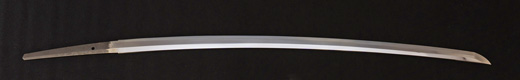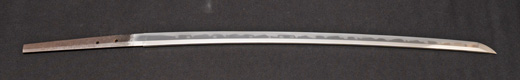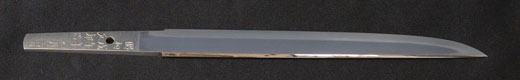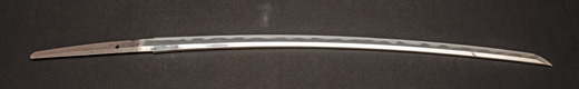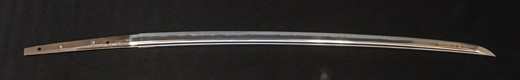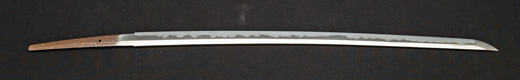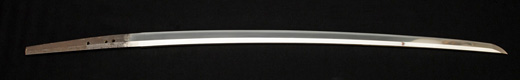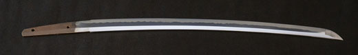 | 刀長 57.8cm(1尺9寸0分) 反り0.5(1分6厘) 元幅 2.97cm 先幅 2.22cm 元重 5.8mm 先重 4.8mm 刀身重量 裸身570g 茎 生 目釘穴 2 刃文丁子刃 |