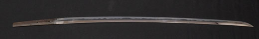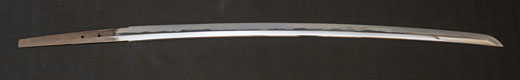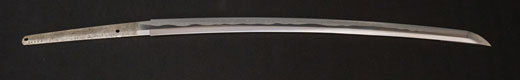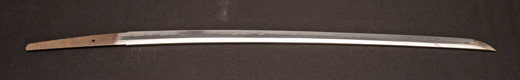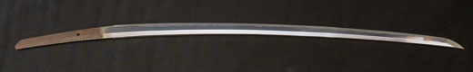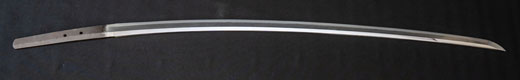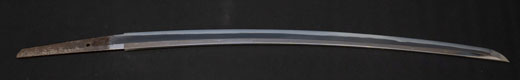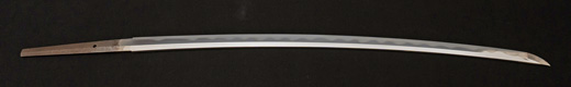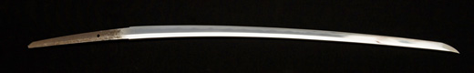 | 刀長 69.8cm(2尺3寸0分) 反り 1.7cm(5分6厘) 元幅 3.02 cm 先幅 2.33 cm 元重 6.2mm 先重 4.9 mm 刀身重量 裸身 680g 鞘を払って 1.020g 茎 生 目釘穴 1 刃文 互ノ目丁字 |