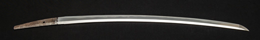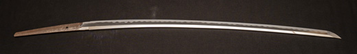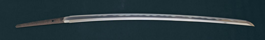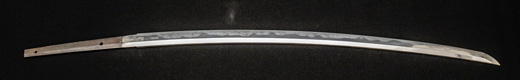 | 刀長 67.2cm(2尺2寸2分) 反り 1.0cm(3分3厘) 元幅 3.02 cm 先幅2.36cm 元重 7.0mm 先重 5.0 mm 刀身重量 裸身 680g 鞘を払って ‐g 茎 生 目釘穴 1 刃文 互ノ目乱 |