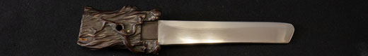 | 刀長 16.3cm(5寸3分) 反り なし 元幅 2.30cm 先幅 1.94cm 元重 4.9mm 先重 4.6mm 重量裸身110g 鞘を払って230g 茎 生 目釘穴 1 刃文 乱刃 |