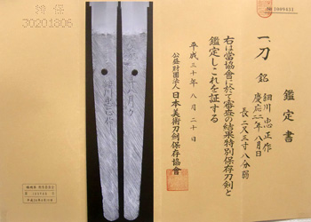 日向延岡藩工 細川忠義の長男 万延元年日向延岡住 慶応二年日向飫肥住 作柄細川正義に近く身巾有 地金小杢肌細かく約み刃紋匂出来細かく足入る。