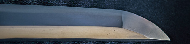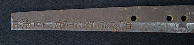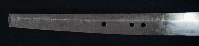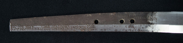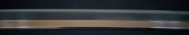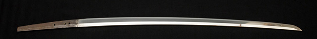 | 刀長 71.0cm(2尺3寸4分) 反り 1.4cm(4分6厘) 元幅 3.14cm 先幅 2.39cm 元重 6.8mm 先重 5.3mm 刀身重量 裸身 830g 鞘を払って 1,150g 茎 摺上 目釘穴 3 刃文 直刃 |