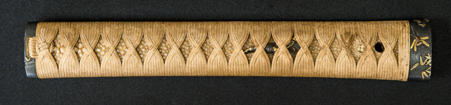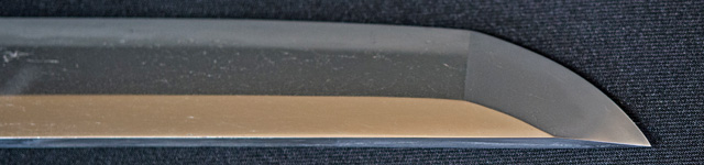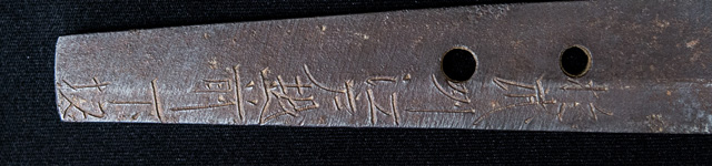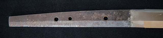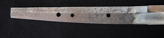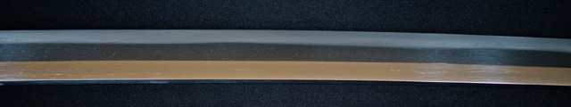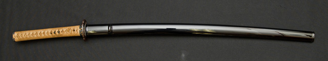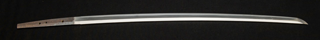 | 刀長 70.4cm(2尺3寸2分) 反り 1.1cm(3分6厘) 元幅 2.96cm 先幅 2.41cm 元重 6.0mm 先重 5.2mm 刀身重量 裸身 730g 鞘を払って 1,000g 茎 摺上 目釘穴 3 刃文 直刃 |