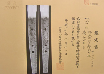 | 刀 於武州江戸越前下坂 慶安四年二月日 |