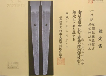 | 刀 尾州住藤原信吉 於武州江戸作之 |