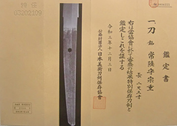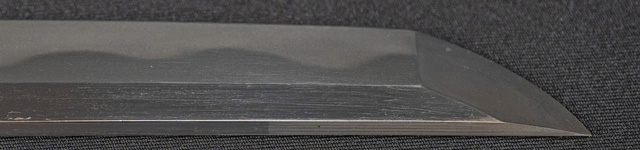 初代の宗重である。越前守助広門人。地金小板肌約む。刃紋大乱刃。沸厚く付き刃冴える。乱刃の谷間に沸足大きく入る。出来良し。