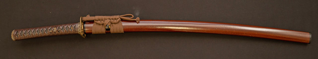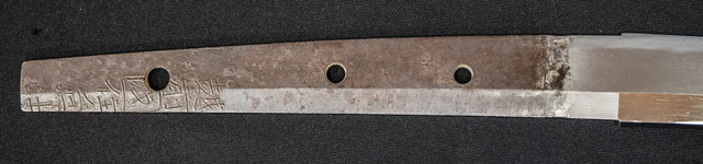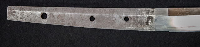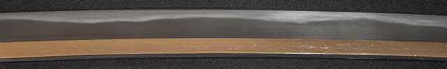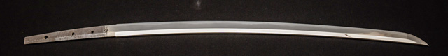刀長 69.7cm(2尺3寸) 反り 1.7cm(5分5厘) 元幅 3.28cm 先幅 2.74cm 元重 6.6mm 先重 5.8mm 刀身重量裸身900g 鞘を払って 1,200g 茎 摺上 目釘穴 3  刃文  のたれ 価格