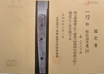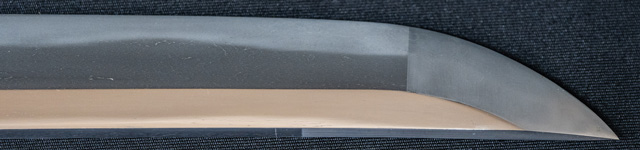 身巾の広い大切先で姿は慶長頃に流行した南北朝の写しで備前の大兼光を写したものであろうか。地金小板目肌立つ。刃紋小沸出来。のたれ刃の中に互ノ目足盛んに入る。