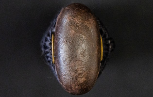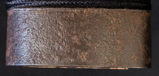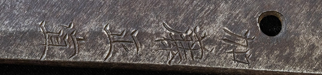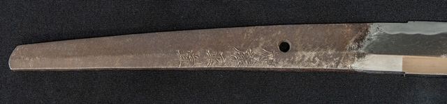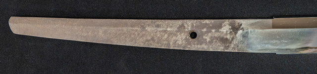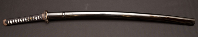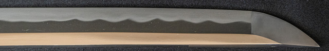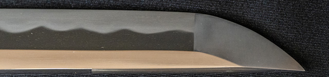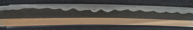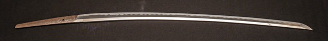 | 刀長 77.2cm(2尺5寸5分弱) 反り 2.2cm(7分2厘) 元幅 3.35cm 先幅 2.44cm 元重 8.2mm 先重 6.2mm 刀身重量裸身1,000g 鞘を払って1,370g茎 生 目釘穴 1 刃文 互ノ目乱 |