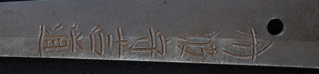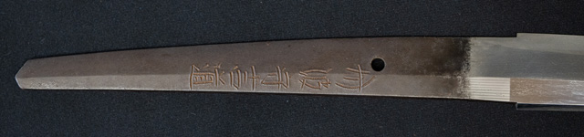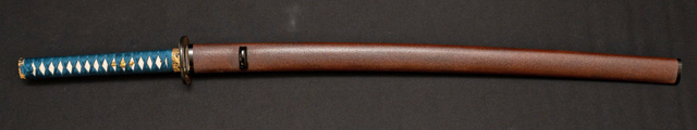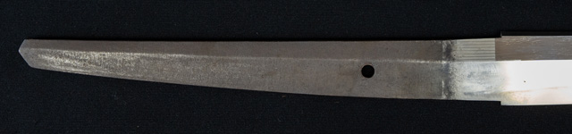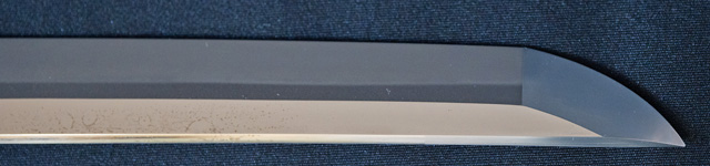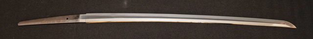 | 刀長 68.5cm(2尺2寸6分5厘) 反り 1.06cm(3分5厘) 元幅 3.32cm 先幅 2.53cm 元重 6.2mm 先重 4.3mm 刀身重量裸身720g 鞘を払って1,100g茎 生 目釘穴 1 刃文 直刃 |