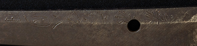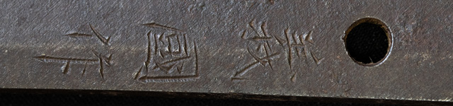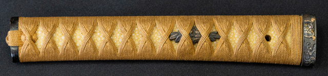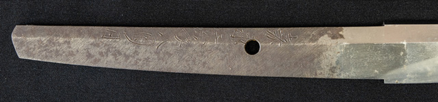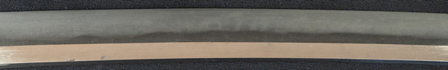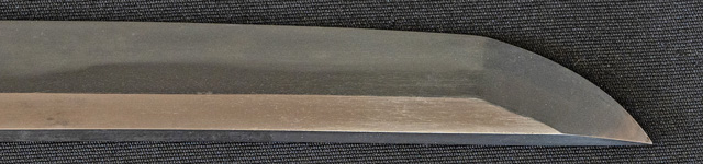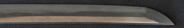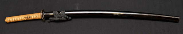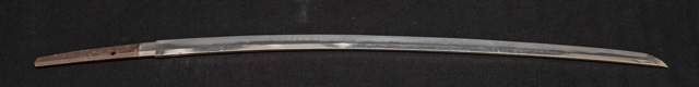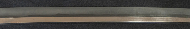 | 刀長 71.3cm(2尺3寸6分) 反り 2.0cm(6分6厘) 元幅 2.79cm 先幅 2.21cm 元重 7.6mm 先重 6.0mm 刀身重量裸身750g 鞘を払って1,000g茎 生 目釘穴 1 刃文 互ノ目丁子 |