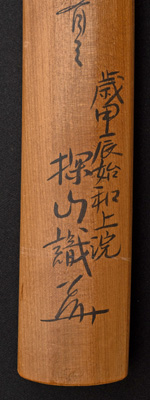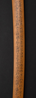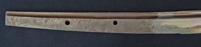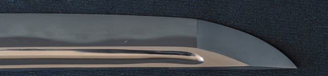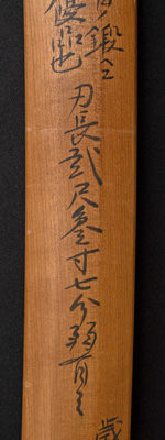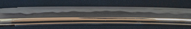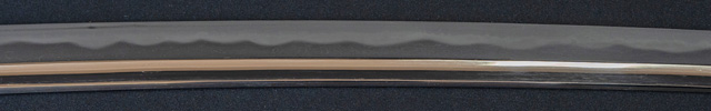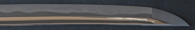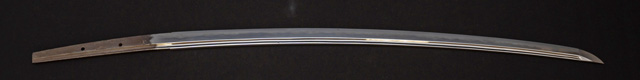 | 刀長 71.9cm(2尺3寸7分) 反り 1.8cm(6分) 元幅 3.15cm 先幅 2.50cm 元重 7.2mm 先重 5.7mm 刀身重量裸身640g 茎 大摺上 目釘穴 2 刃文 丁子 |