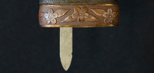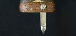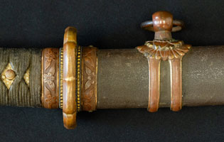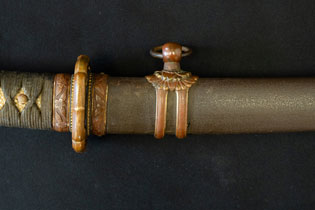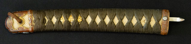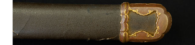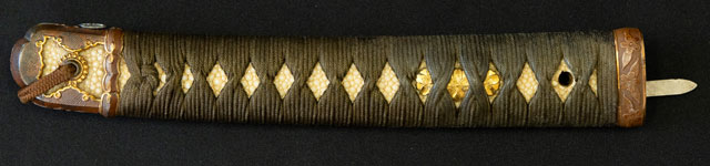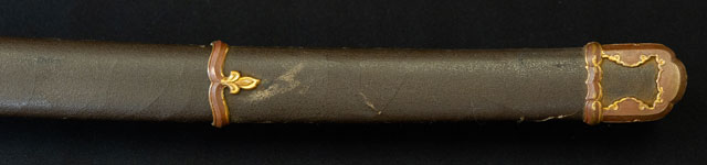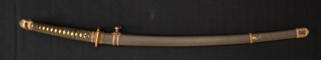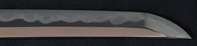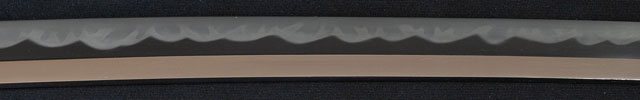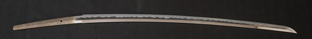 | 刀長 68.2cm(2尺2寸5分) 反り 1.8cm(6分) 元幅 3.04cm 先幅 2.29 cm 元重 6.6 mm 先重 5.0 mm 刀身重量裸身700g 茎 生 目釘穴 1 刃文 乱刃 |