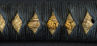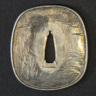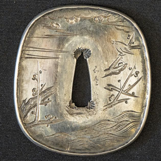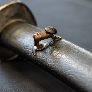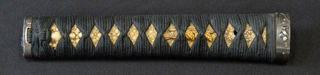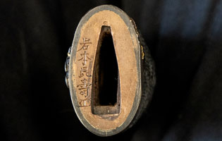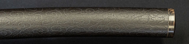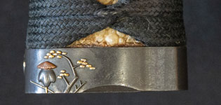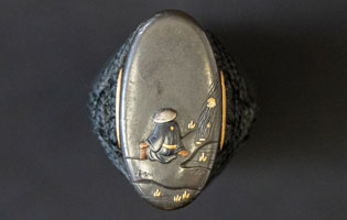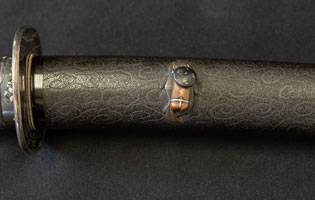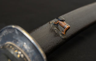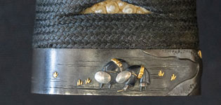刃紋直刃小沸出来・地金小杢肌良く錬る。拵鞘の栗型か船頭がなまずに乗っている図が良く生きていて思わず笑ってしまう名品である。 |