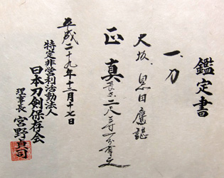 三原正近の裔という。初銘正次 江戸播磨にても打つと云う。攝津住 刃紋直刃沸足互ノ目に入り力強い沸豊富に付き刃冴えて出来が良い。