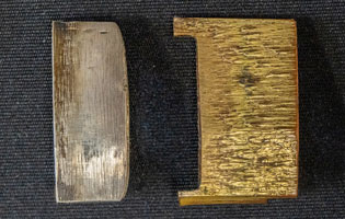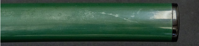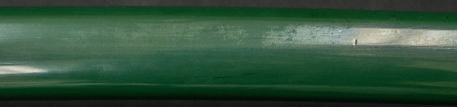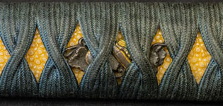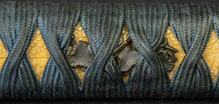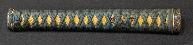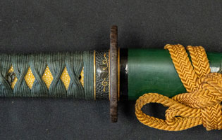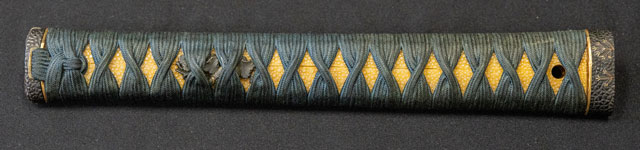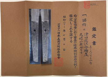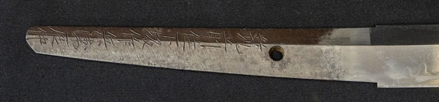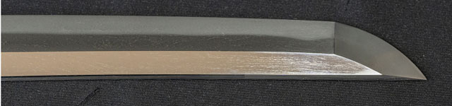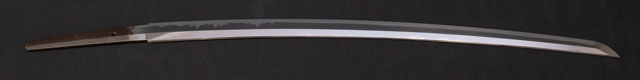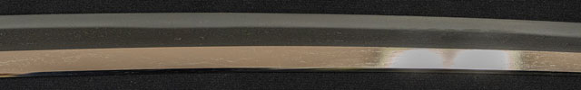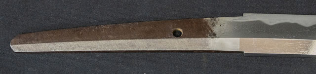 | 刀長 63.7cm(2尺1寸-分) 反り 1.7cm(5分6厘) 元幅 3.06cm 先幅 2.41cm 元重 8.6mm 先重 6.3mm 刀身重量裸身720g 鞘を払って1,020g 茎 生 目釘穴 1 刃文 元 三本杉 物打 直刃 |