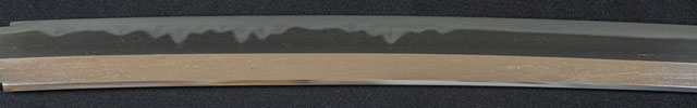 刃紋元は注文主の依頼であろうか、三本杉、三分の二は直刃を焼いてあり小沸出来。 |
