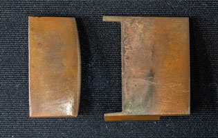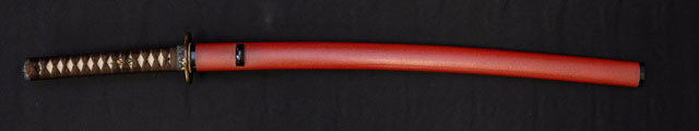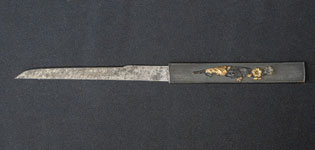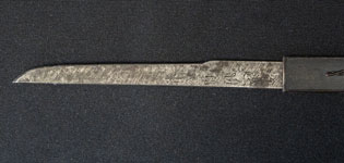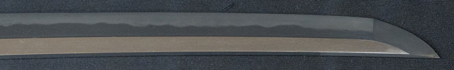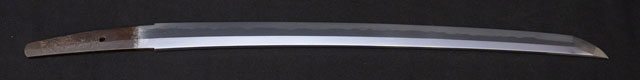 | 刀長 45.0cm(-尺-寸-分) 反り 0.6cm(-分-厘) 元幅 2.88cm 先幅 2.36cm 元重 6.4mm 先重 5.4mm 刀身重量裸身-g 鞘を払って-g 茎 生 目釘穴 1 刃文 互ノ目乱 |