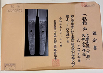 | 脇指 銘 大慶直胤(花押)天保二年仲春 |