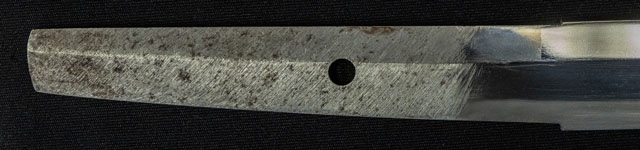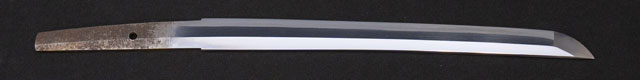 刀長 28.1cm(0尺9寸3分) 反り 0.2cm(0分9厘) 元幅 2.46cm 先幅 2.12cm 元重 5.3mm 先重 5.0mm 刀身重量裸身230g 鞘を払って-g 生 目釘穴 1  刃文 小互ノ目乱 価格