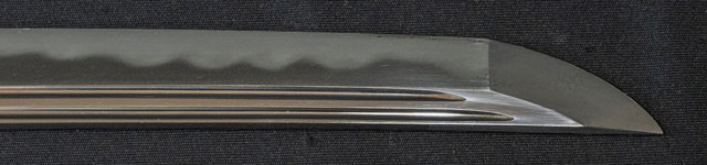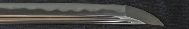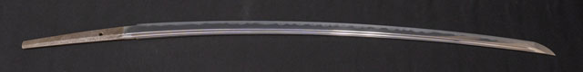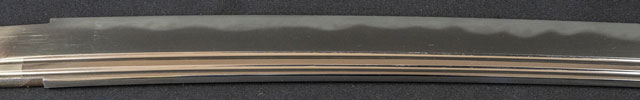 | 刀長 74.9cm(2尺4寸7分) 反り 2.2cm(7分2厘) 元幅 3.19cm 先幅 2.31cm 元重 7.2mm 先重 4.5mm 刀身重量裸身788g 鞘を払って-g 茎 生 目釘穴 1 刃文 互ノ目丁字 |