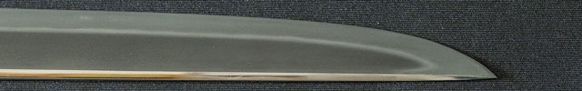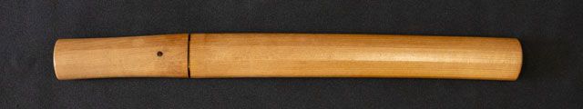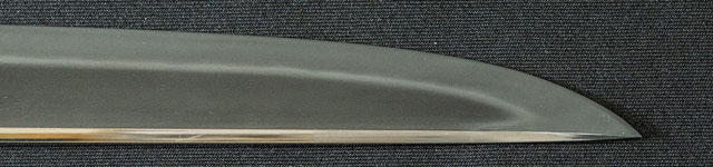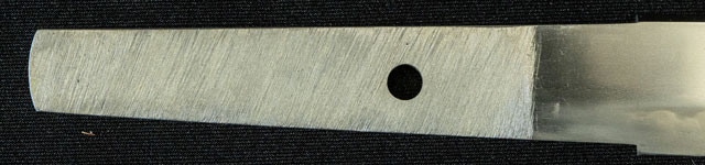 | 刀長 24.3cm(1尺8寸強) 反り 0.0cm(1分1厘) 元幅 2.41cm 先幅 2.17cm 元重 5.9mm 先重 4.7mm 刀身重量裸身170g 鞘を払って-g 茎 生 目釘穴 1 刃文 直刃 |