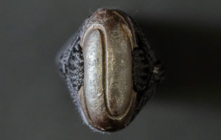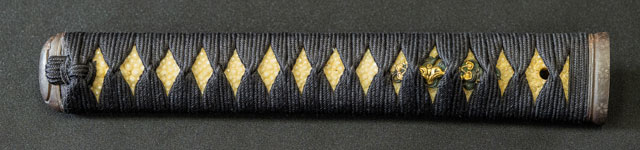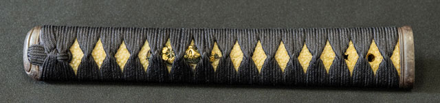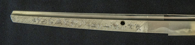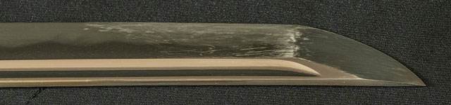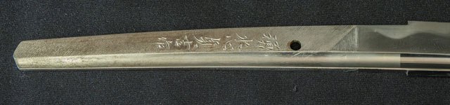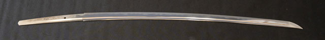 | 刀長 71.7cm(2尺3寸7分) 反り 1.9cm(6分3厘) 元幅 3.10cm 先幅 2.51cm 元重 6.7mm 先重 5.4mm 刀身重量裸身670g 鞘を払って1.130g 茎 生 目釘穴 1 刃文 乱刃 |