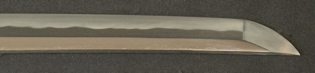刀長 67.2cm(2尺2寸2分) 反り 1.0cm(3分3厘) 元幅 3.02cm 先幅 2.36cm 元重 7.0mm 先重 5.0mm 刀身重量裸身680g 鞘を払って-g 生 目釘穴 1  刃文 互ノ目乱 価格